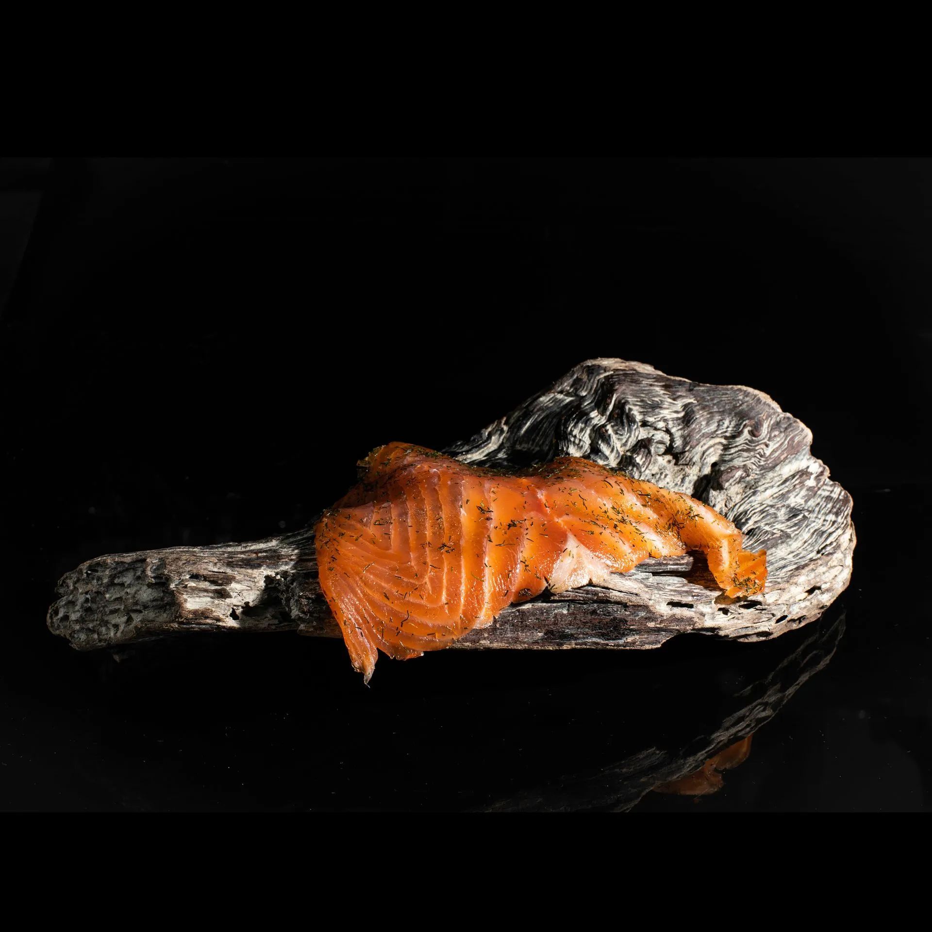 Unlike conventional smoked salmon reliant on simple salt and oak, we begin the cure with a mineral-rich, sweet salt and a touch of sugar. We then gently smoke our salmon over an exclusive, proprietary blend of three fine woods: oak for body, apple for sweetness, and beech for a clean, smooth finish. This intricate process, combined with an extended, patient curing period, transforms the fish into something transcendent.